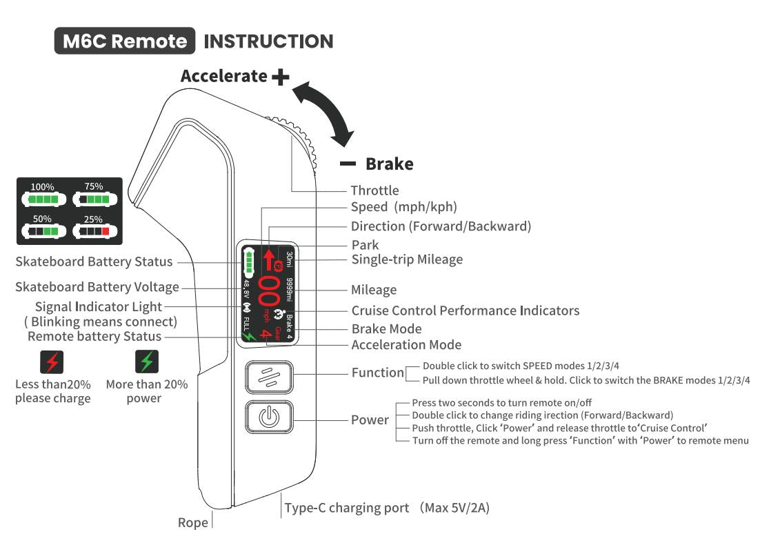 To reduce the risk of false triggering during driving, the M6C remote uses the double-click function key to switch the speed mode. Modes 1-2 are perfect for beginners, while modes 3-4 cater to experienced riders. Choose the mode that matches your comfort level and riding style.